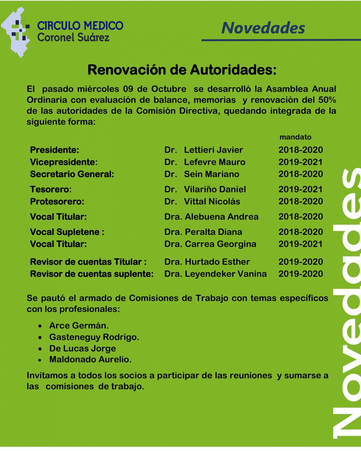 El día 09 de Octubre del 2019 se desarrolló la Asamblea Anual Ordinaria con evaluación de balance, memorias y renovación del 50% de las autoridades de la Comisión Directiva, quedando integrada como se muestra en la imagen a continuación...